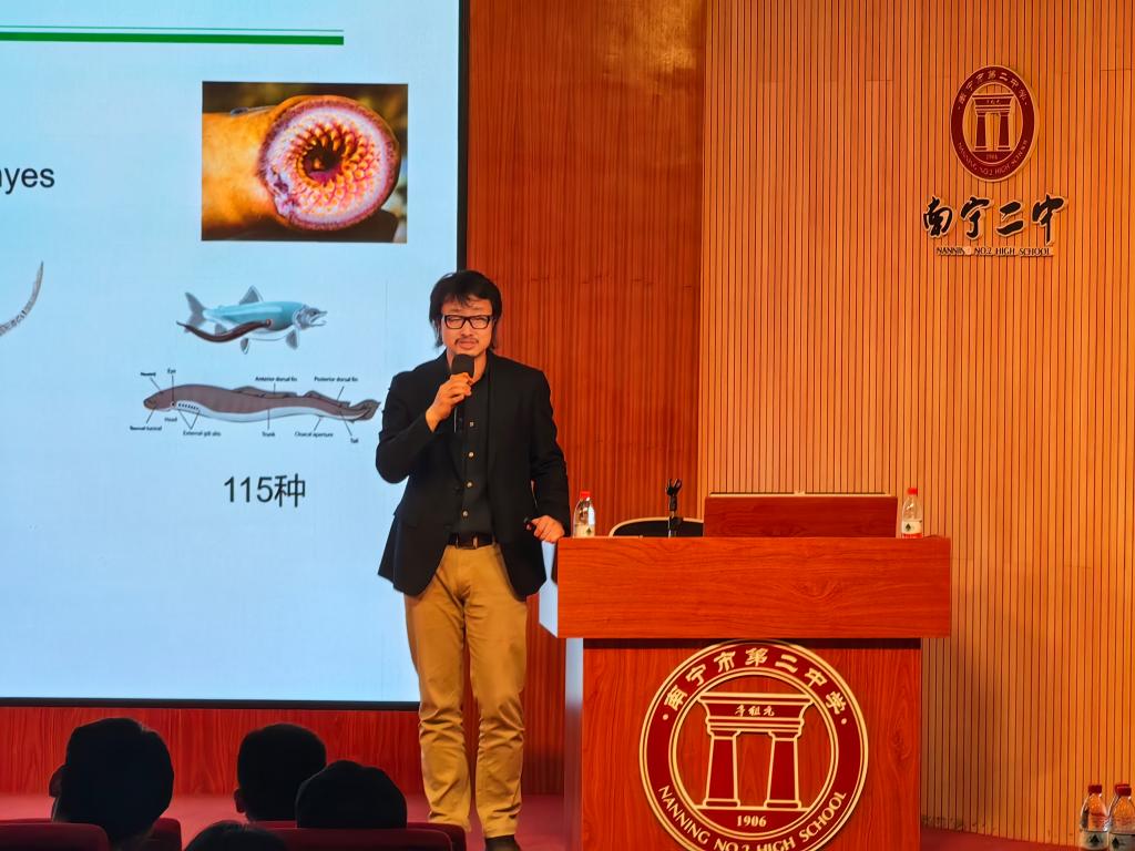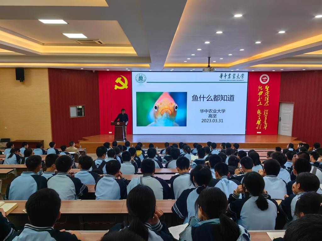 水产公司副经理高坚教授分别给两所中学500余名师生带来了主题为“鱼什么都知道”的科普报告。高坚从鱼的类目、视觉、听觉、繁衍等方面带领同学们走进鱼的世界,他从硬骨鱼、软骨鱼的种类切入,介绍了各种鱼的分类及特点。“同学们,你们觉得鱼能听到声音吗?”高坚向同学们问道,并详细介绍了鱼类听觉器官——韦伯式器的功能。随后他分享了鱼的繁衍,当谈到鮟鱇鱼时,高坚说道:“鮟鱇鱼雌雄异体,但是雌性会是雄性的30多倍,雄鱼会寄生在雌鱼身上,这就是鱼类吃软饭的典型!”幽默的语言瞬间点燃了课堂氛围。报告的最后,高坚对在场高中生发出“邀请函”:“欢迎到伟德victor1946官网,让我们一同去发现水世界的奥秘。”