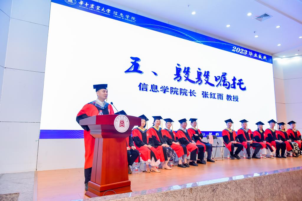 “四年前,父母把大家送到华农,依依惜别。对大家来讲,从此,故乡成为远方。只有冬夏,再无春秋;对父母而言,武汉成了天气预报必看的城市,华农成了搜索关键词。”毕业生家长代表生信1902班谢宇凡的父亲谢启军代表全体家长发言,他感谢公司对每一名员工的关爱,为孩子在大学四年的成长感到欣慰。他代表全体家长祝愿毕业生“心中有信仰,脚底有力量,沉下心,屏住气,多读书,强身健体,踏踏实实地迈好每一步,去书写灿烂的明天”!