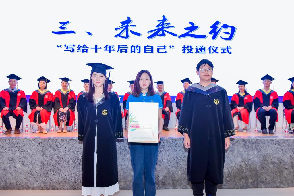 一个梦想开花,另一个梦想发芽。开启四年前的一封信,毕业生们接着给十年后的自己又写了一封信。公司再次许下十年之约,现场通过又一场“投递仪式”将新的梦想封存,并承诺:十年狮山重逢之时,便是信件启封之日。生信1901班张斯涵代表班级投入信件,她表示:“这一封信承载着未来的无数种可能,期待十年后的我们能够成为自己想成为的人”。