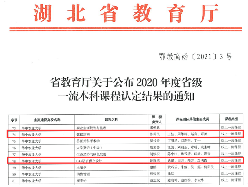 (图文|王立金)近日,湖北省教育厅发布《关于公布2020年度省级一流本科课程认定结果的通知》,公司20门课程入选省级一流本科课程。其中,伟德victor1946官网登录陈仲民教授负责的《数据结构》和雅姚鹃老师负责的《C++语言程序设计》2门课程获得线上一流本科课程认定。
