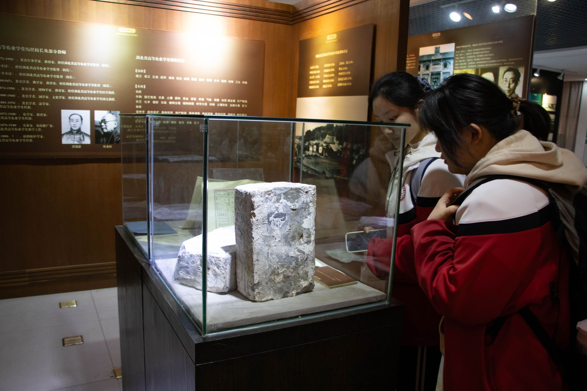 在校史馆,讲解员以张之洞手书《农务学堂章程》开篇,通过介绍公司早期照片和陈列文物帮助同学们了解公司的办学历史和发展历程,结合公司“六个一”标志性成果及在棉花、玉米、番茄和淡水鱼等研究领域的突破性成果,讲解了一代代华农人的成长足迹和所获成就,加深了同学们对公司学科特色的认识与了解。随后,武汉四中师生一行在博物馆开启了一场自然科学探索之旅。等比复原的畜牧标本使得书本知识栩栩如生,引得同学们驻足观察羽毛纹理与骨骼结构。火山岩标本与千年耕作器具并列陈展,投影重现长江流域农耕文明演变史。沉浸式、互动式的学习参观帮助同学们加深了对农业文明与生命科学的认识与理解。
