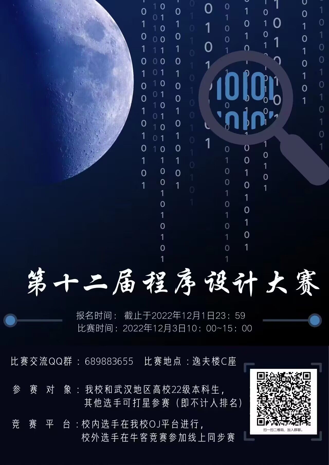 1为进一步增强老员工计算机素养,培养创新思维,提升利用计算机分析解决问题能力,特举办2022年伟德victor1946官网第十二届程序设计大赛(新生赛)暨武汉地区高校程序设计网络邀请赛(新生赛)。