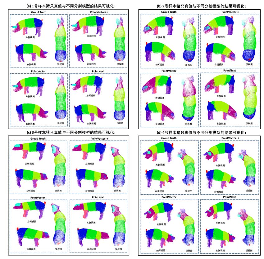 其次,为提升点云分割精度,本研究从降采样和特征提取的角度出发,在PointVector模型基础上提出PointVector++模型,在猪点云分割数据集上取得更好分割精度。实验结果表明,PointVector++ 在公共数据集S3DIS较基准模型(PointVector)的总体准确率(OA)、平均类别准确率(mACC)和平均交并比(mIoU)分别提升1.8%、0.9%和1.5%。在公共数据集 ShapeNetPart上实例级交并比(Instance mIoU)和类别级平均交并比(Class_mIoU)分别提升0.9%和2.2%,在猪点云数据集上 Instance mIoU提升至 90.5%,较基准模型提高 4.5%。其分割可视化效果如图2所示,这些可视化结果进一步验证,PointVector++模型在面对复杂猪体姿态、结构变异与局部遮挡等多重挑战下,仍具备强大分割能力与良好泛化性能。