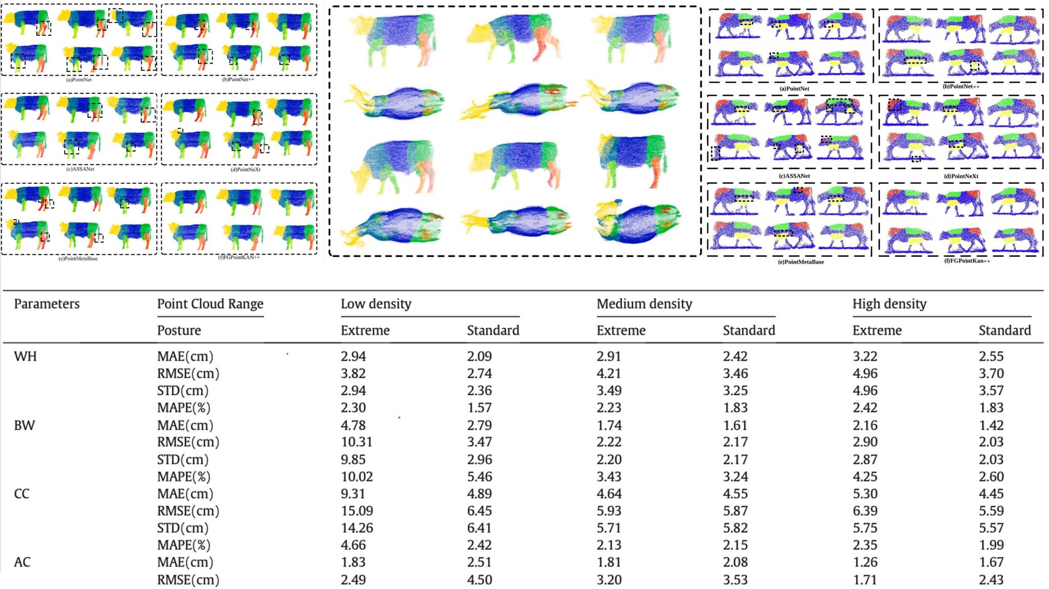 团队围绕现代畜牧业中奶牛体型精准测量这一问题,面对传统人工测量效率低下且易受动物姿态影响的行业痛点,创新性提出基于深度学习的像素级点云分割模型与自适应关键切面识别算法,为实现规模化养殖场奶牛生长监测自动化提供了可靠技术方案。该研究通过构建FGPointKNN++分割模型和AKCPR关键切面识别算法,实现不同姿态下奶牛像素级点云分割(mIoU达83.24%)与体尺参数自动测量。