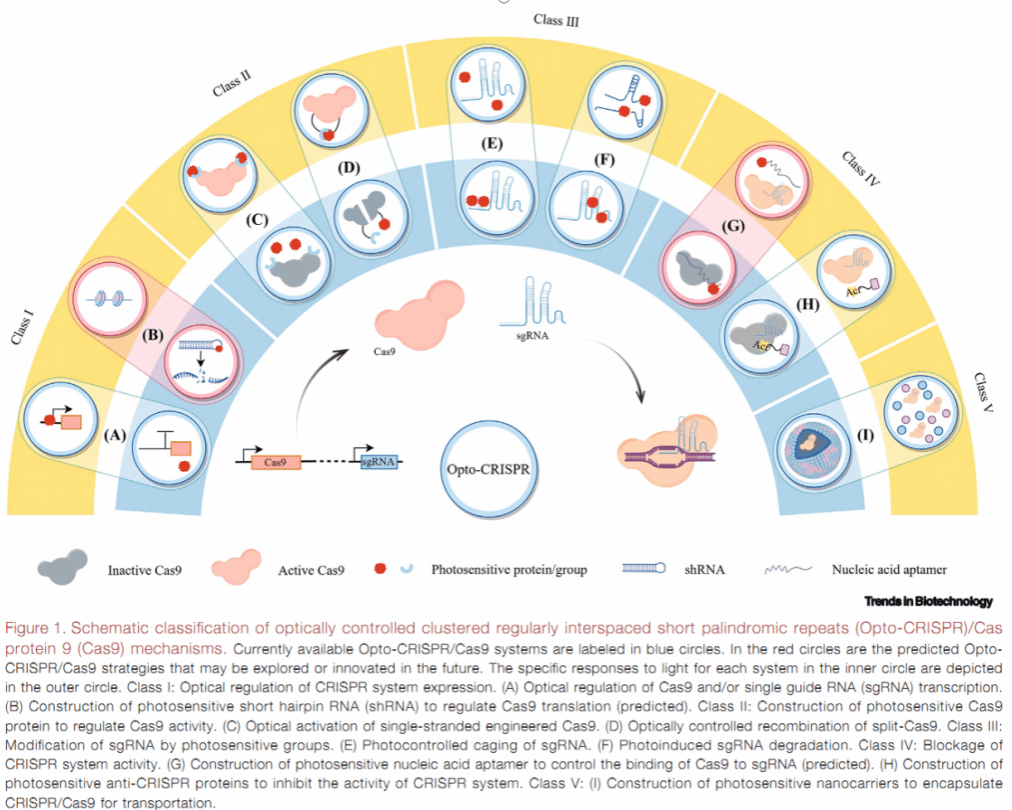 文章指出,传统CRISPR/Cas系统因缺乏时空精度而面临脱靶风险、表达泄漏等瓶颈。光遗传学(optogenetics)的引入,为基因编辑装上“精准导航”,使CRISPR获得了“光开关”能力——研究者可用不同波长的光束远程、可逆、无损地启动或关闭基因编辑与转录调控。马彬广团队将现有Opto-CRISPR机制归纳为五大类(图1):包括光学控制Cas9/sgRNA转录、构建光敏Cas9蛋白、光笼化sgRNA、光敏抗CRISPR(Acr)蛋白阻断系统活性、光响应纳米载体递送RNP复合物等。文中用18页篇幅、5幅示意图和1张系统对比表,详尽解析了从蓝光到远红光、从体外细胞到活体小鼠的近40种代表性平台。