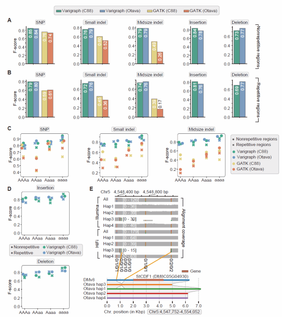 在异源四倍体油菜、异源六倍体小麦以及同源四倍体马铃薯等基因组上的测试,表明Varigraph同样优于其他软件;Varigraph能在较短时间内处理近1.1亿个变异构成的小麦泛基因组图谱,且结构变异的分型F值超过0.7。Varigraph能实现同源四倍体的变异分型,能较为精确地区分双等位变异下的五种可能的基因型。其中,对于插入和缺失类型的结构变异分型F-值能达到0.73-0.81。