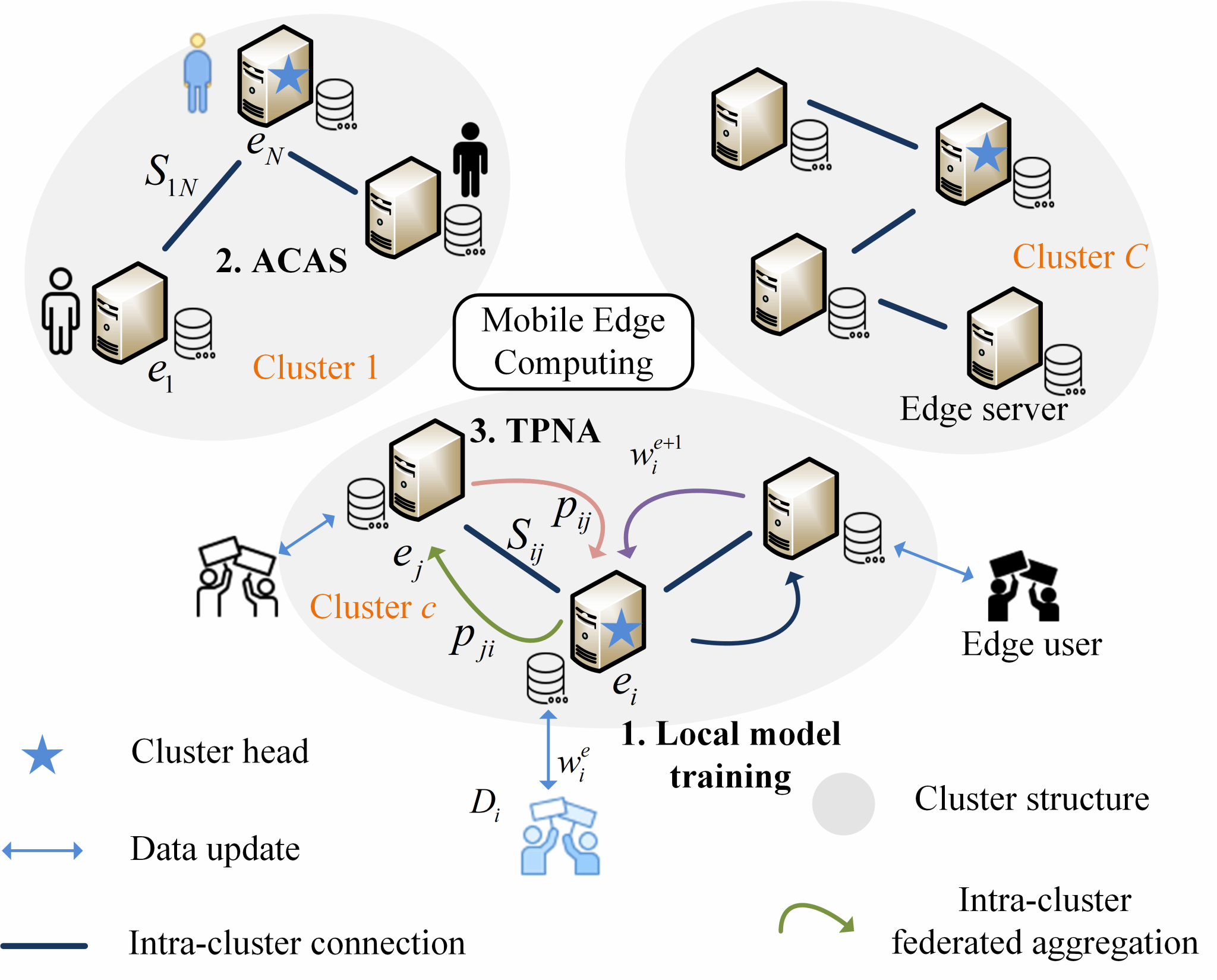 在移动边缘计算场景下,终端用户频繁移动、设备数量庞大且数据分布高度异构,给智能协同带来了网络动态性与数据异质性等挑战。现有聚类联邦学习方法大多依赖中心服务器进行聚类,容易出现单点故障、通信开销大、扩展性差等问题。此外,现有方法通常需提前预设聚簇数量,缺乏动态适应性,难以满足移动边缘计算网络的实际需求。