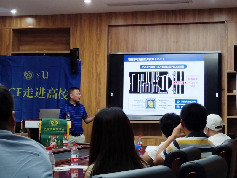 武玲娟代表公司对CCF容错专委3位学者及师生的到来表示热烈欢迎,并对3位学者作了简要介绍。张吉良教授介绍了专委的历史、近期专委承办的学术活动和年会等,然后他以“集成电路硬件安全”为题,从中国对集成电路的需求、芯片自给率不足以及中兴华为事件出发,介绍了当前集成电路面临的硬件木马、侧信道、逆向工程等严重安全威胁。接着介绍了新型集成电路硬件安全关键技术,物理不可克隆芯片(PUF)设计及应用、集成电路芯核(IP)保护技术以及硬件辅助安全等前沿研究方向,并介绍了课题组在物理不可克隆安全芯片研究、IP核保护等领域取得的系列研究成果。