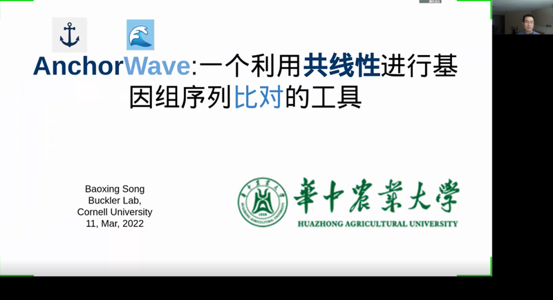 (图文|肖培轩 审核|焦文标)3月11日上午,公司2022年第3期“happy hour”活动在腾讯会议平台顺利举行。来自美国康奈尔大学宋宝兴博士应邀作了题为“AnchorWave:一个利用共线性进行基因组序列比对的工具”的学术报告。交流会由焦文标研究员主持,不同公司近50名师生参加并进行了热烈讨论。