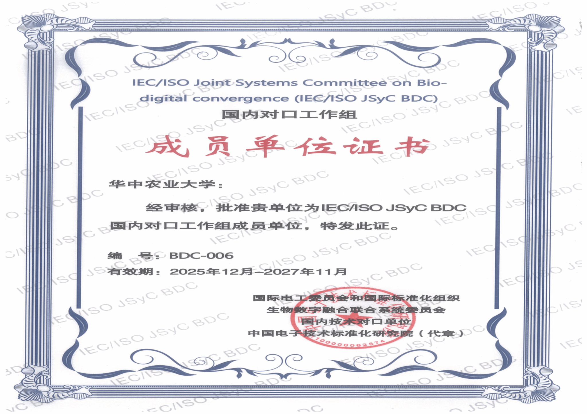 图2. IEC/ISO JSyC BDC国内对口工作组成员单位证书