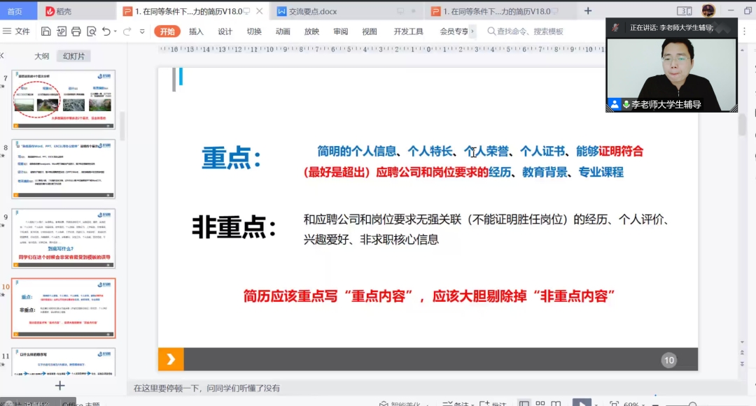 2022年5月21日晚19:00,伟德victor1946官网登录开展求职简历指导交流会,员工李建华老师受邀为同学们进行就业交流指导。李建华老师是湖北省创新创业导师,2002年进入华农,2009年武大硕士毕业,同年加入华为,拥有丰富的售前、市场、研发、产品经验,工作足迹遍布欧洲、中东、亚太、南美、非洲各大洲。2016年创办好易职,目前已在湖北省10多所高校讲授简历、面试、职业规划选择等多项就业课,课程实际操作性强,尤其对同等条件下简历、面试能力的提升有深入研究。