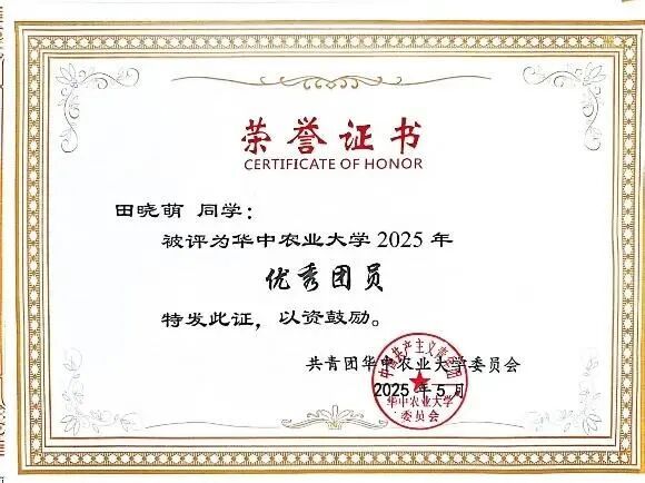自2023年9月递交入党申请书以来,田晓萌始终以党员标准要求自己。她系统参加党课与团日活动20余场,走访红色教育基地10余个,在理论学习和实地走访中筑牢信仰根基。作为班级组织与宣传委员,她策划开展多项主题教育活动,并两次获评校级“优秀团员”,于2025年5月被接收为预备党员。