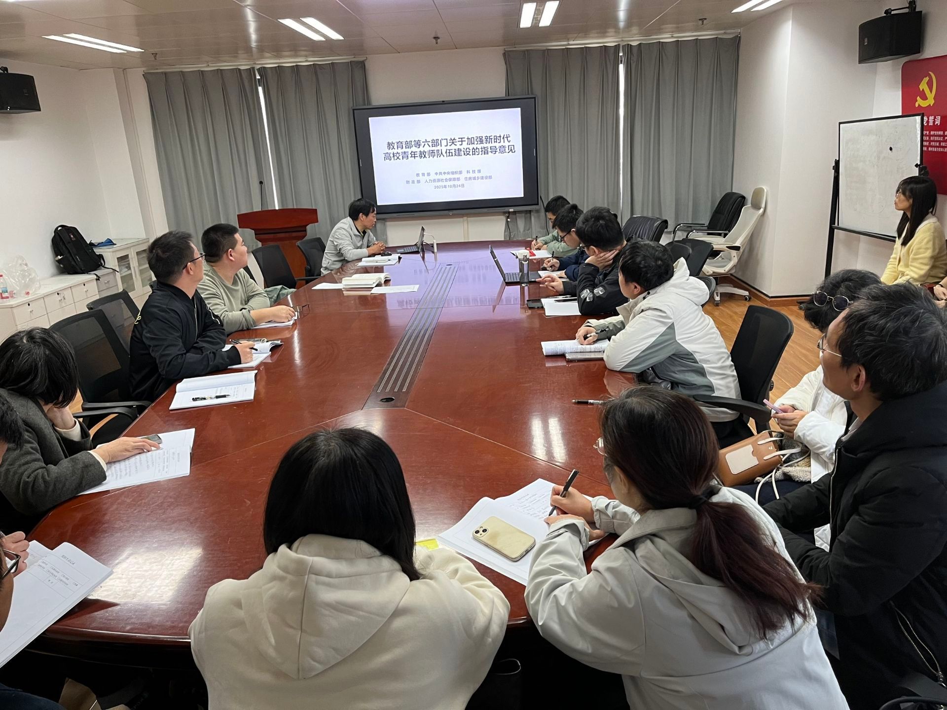 部分党支部结合专业、团队建设实际,重点研学了《教育部等六部门关于加强新时代高校青年教师队伍建设的指导意见》,部分党支部组织了对中央宣传部、教育部联合制作的《闪亮的名字——2025最美教师发布仪式》专题电视节目的集中收看学习。