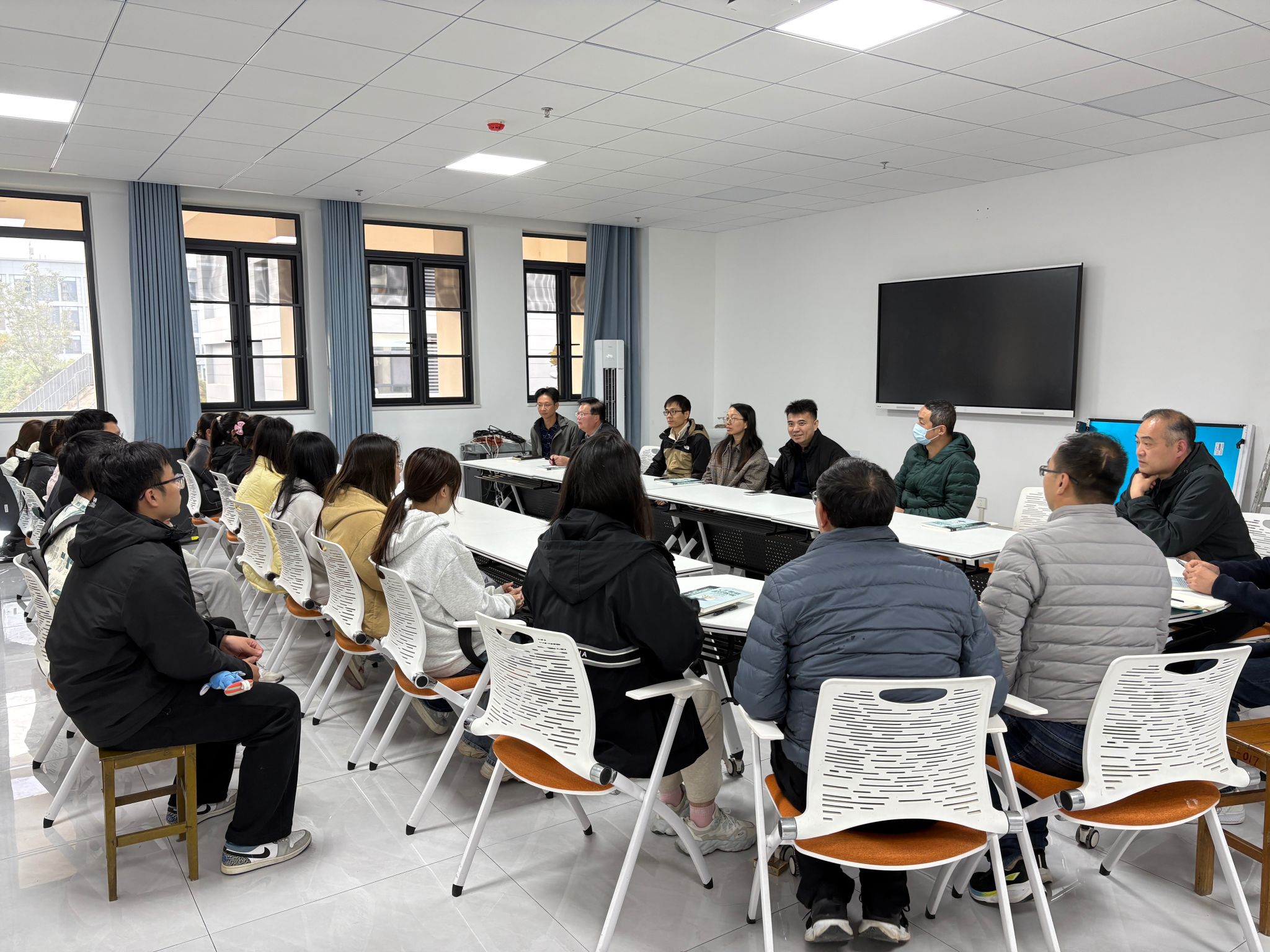 教学研讨结束,张红雨教授一行与信阳师范老员工物信息系的同学们进行了亲切座谈。面对员工们普遍关心的专业就业方向与职业前景问题,老师们给出了中肯建议。