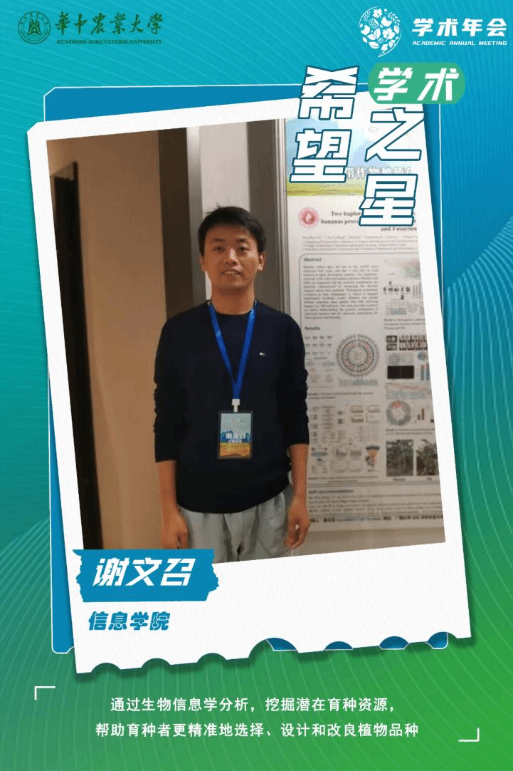 谢文召长期专注于利用多组学数据组装并解析植物基因组方面的研究。本科期间在河北农业大学学报上发表成果“小麦小分子RNA TaMIR 1129介导植株抵御低氮逆境功能研究”,表明TaMIR 1129与靶基因构建miRNA/target模块在介导植株抵御低氮逆境中发挥重要作用。2021年在Molecular Plant发表研究“Two gap-free reference genomes and a global view of the centromere architecture in rice”(被评为Molecular Plant 2021年度最佳论文),首次在国际上构建了两个优良水稻品种珍汕97和明恢63的Gap-free参考基因组,解析了两者间的序列差异,并深入分析了着丝粒结构,为阐明杂种优势机理奠定了坚实基础。2023年在Plant Communications发表研究“Two haplotype-resolved genome assemblies for AAB allotriploid bananas provide insights into banana subgenome asymmetric evolution and Fusarium wilt control”(封面文章候选),首次在国际上组装染色体级别的异源三倍体香蕉栽培种(AAB)参考基因组,首次精确阐明了Plantain和Silk的祖先贡献,验证了Mp-MYB36转录因子可能通过调控木质素开关PAL基因强化细胞壁在植物防御中发挥重要作用,研究结果为阐明香蕉遗传多样性奠定了基础。