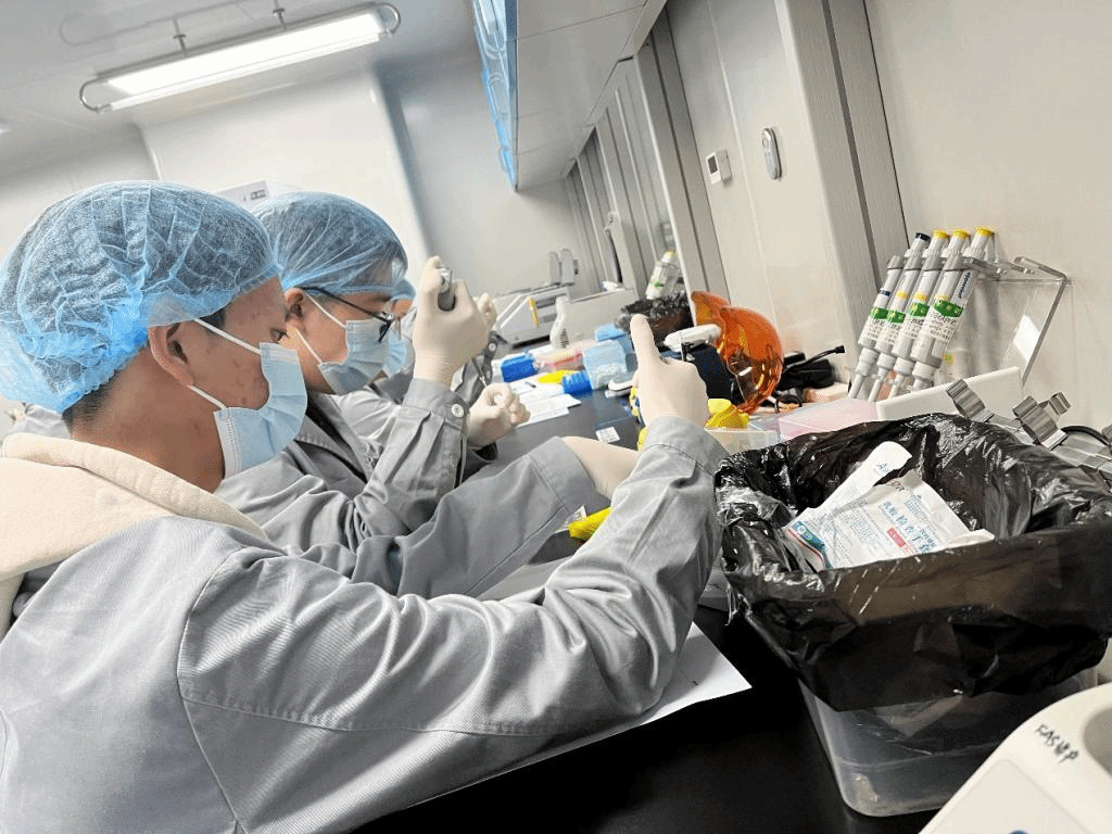 在实践环节,根据企业项目小组划分要求,同学们被分成了6-7人的实验组,进行了自动化建库的模拟实操、模拟上机等。当很多团队在真正的实操中遇到困难时,同学们才深刻感受到理论和实践的距离。生信2101班张昊阳谈到:“虽然感觉课本上实验过程都已经记住,但我们小组在面对具体实验中却还是有些手忙脚乱,甚至曾一度不知如何下手。好在实验员老师再次耐心给我们讲解实验步骤、进行示范并强调了团队协作的重要性。最后我们每人都动手操作,各自负责一部分实验内容,终于赶在下课前完成了实验任务。”武汉华大智造科技有限公司实验员老师谈到:“同学们整体的基础理论知识掌握的很扎实,学习能力也很强,在我们实验员的指导下能够快速将理论应用到具体的实验中来,所有同学都通过了基因测序相关技术的企业考核。”