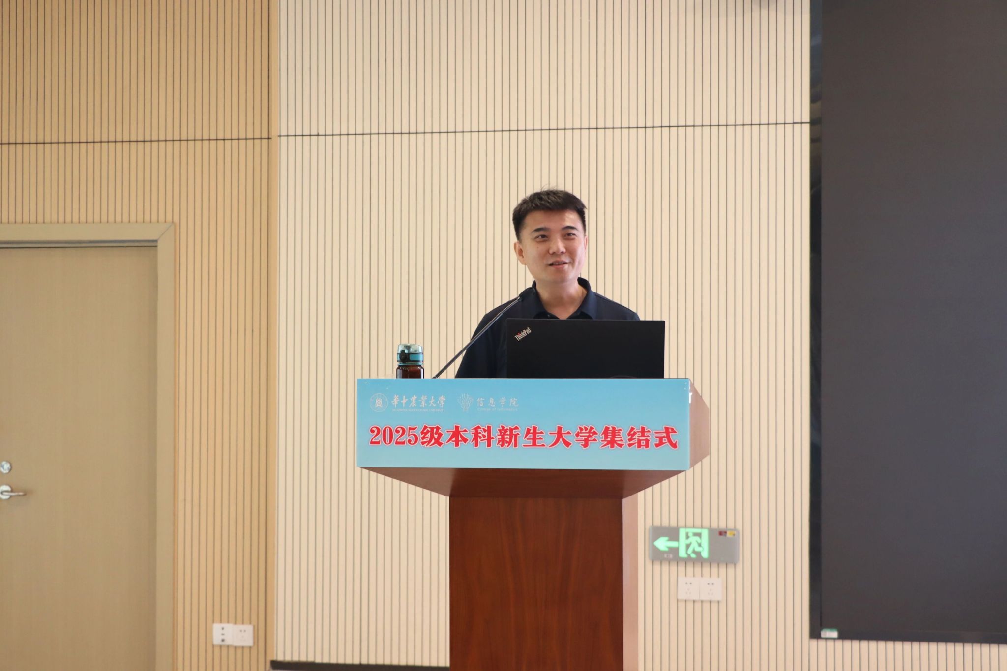 李国亮以“人工智能与时代使命”为主题致辞,他首先围绕公司发展,介绍了伟德victor1946官网登录在人工智能、计算机科学、生物信息学等方向的学科布局,进一步引出人工智能的战略意义,他也向新生提出三点期望:一是深刻认识人工智能的战略意义,筑牢专业根基;二是系统学习数学与AI核心技术,强化动手与实践能力,掌握AI技术需要扎实的数理基础和系统的实践训练;三是积极投身“AI+农业”“AI+生物”等交叉领域,将技术学习与个人理想相结合,以智能技术回应时代命题。他鼓励同学们秉承“勤读力耕、立己达人”的校训精神,以代码书写青春,用智能创造未来,努力成为担当民族复兴大任的时代新人。