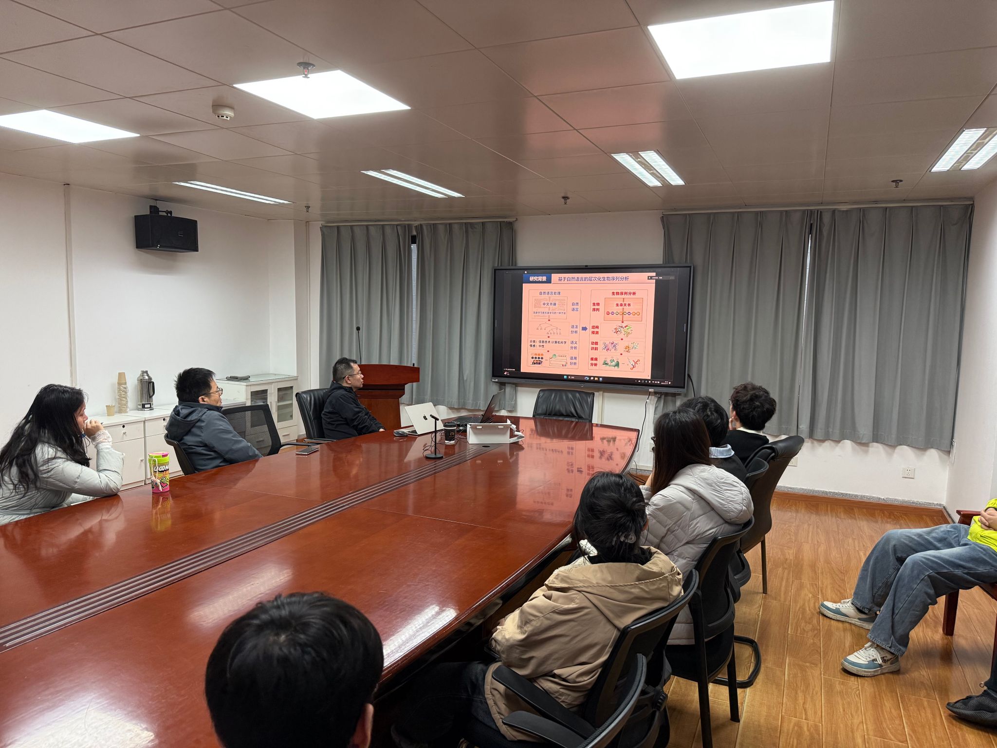 报告中,刘滨教授首先指出,生物序列与自然语言在演化机制、统计特征、语义表达等方面存在显著相似性,因此近年来NLP技术在蛋白质结构预测等生命科学任务中取得突破。然而,NLP直接用于生物序列分析仍面临三大挑战:序列表示困难,生物分子特征复杂;语义检测难,序列相似度低且同源性噪声高;语用分析难,功能与疾病关联机制高度隐含。