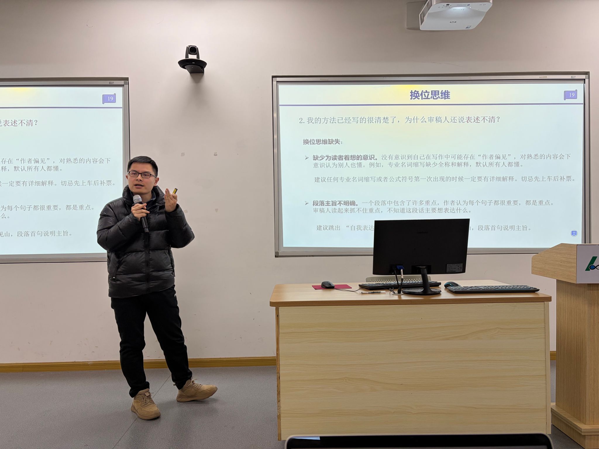 (图文|李浩然 编辑|信息 审核|章文)1月8日下午,公司第164期“Happy Hour”活动在A102举行。此次活动主题为“AI时代的科研写作与投稿经验分享”,特邀沙灜、陈洪、王玉龙、王欢、李万理等5位在AI领域顶刊发表经验丰富的教师,从涵盖创新思路、写作思维、创新点发掘等多维度为研究生讲解如何进行高水平的论文写作与投稿。公司副经理章文老师主持分享会。