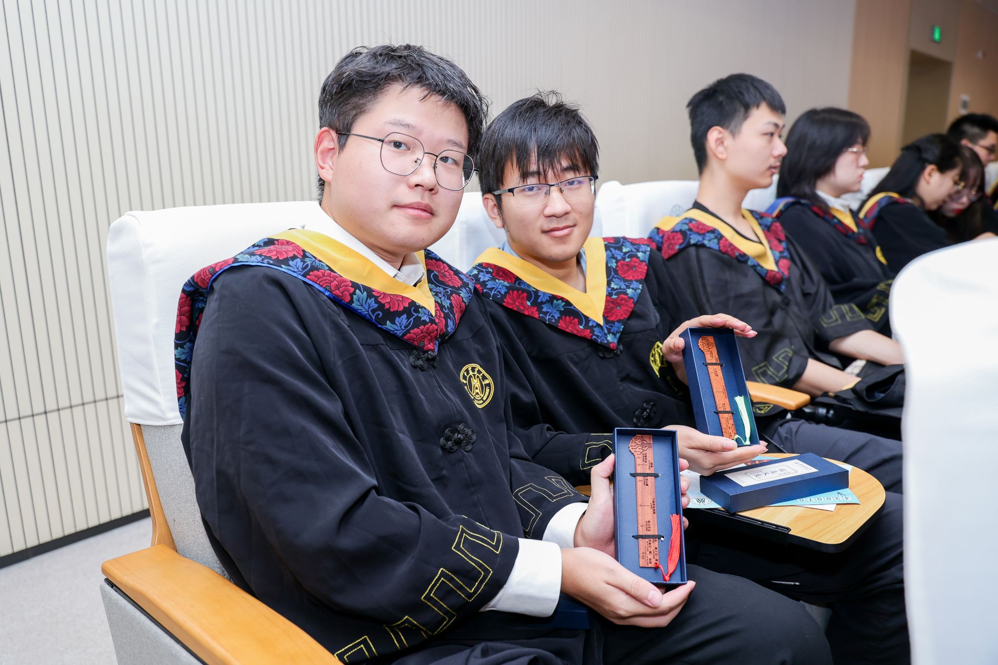 在毕业生期待的目光中,刘进揭晓了今年的毕业礼物——定制书签尺。它由红木制成,流苏有7种色彩,正面刻度长12cm,右端设计成院徽“信息树”形状,反面印有公司西大门图和公司价值追求“为了人类心智的荣耀”。最特别的是,公司将长度化为时间轴,将12cm刻度当作四年时间,选取了2021级本科生四年间最具标志性的时间点进行了标注。包括:开学报到、第一堂课、第一场考试、军训、专业分流等。