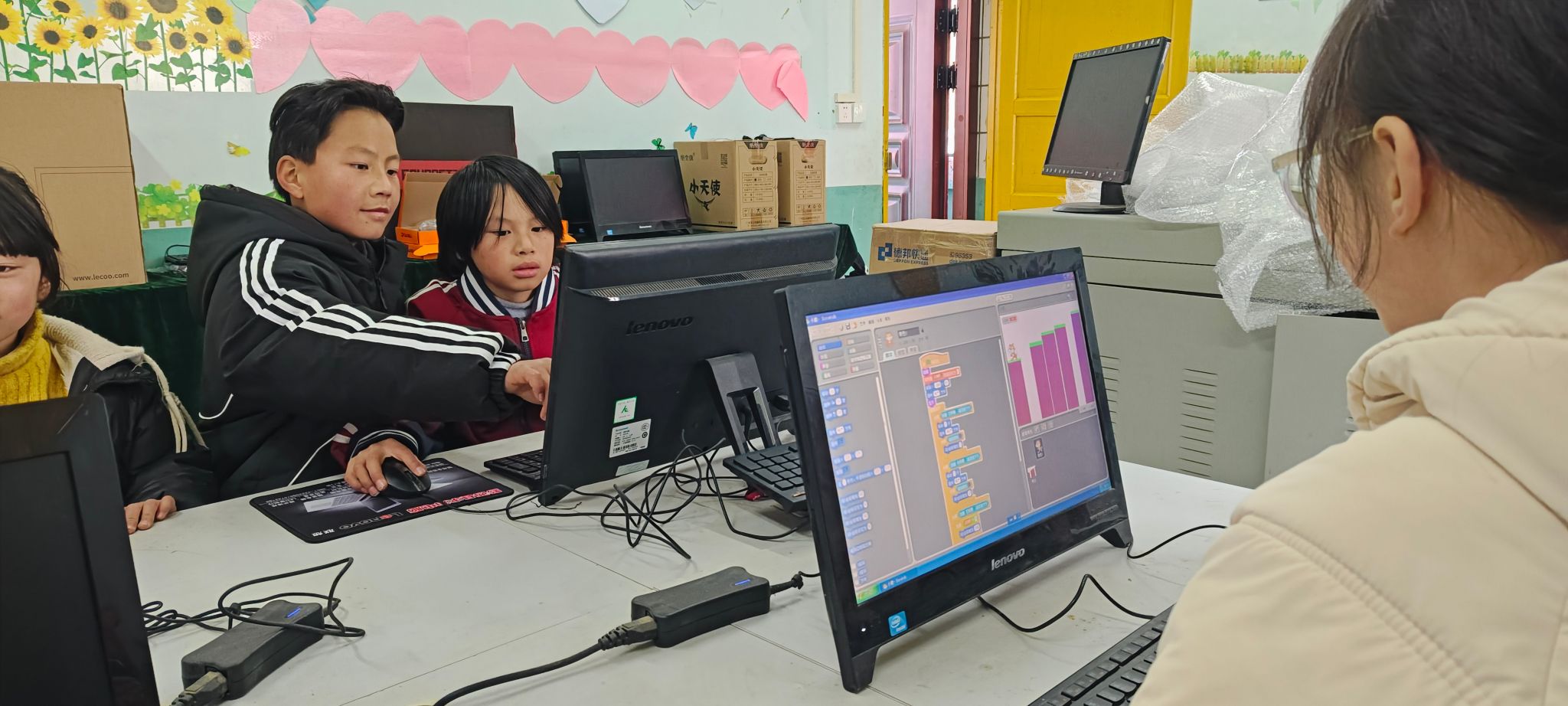 在整个秋季学期的教学中,面对孩子们“找不到光标”“拖不动积木”“打不出汉字”的实操困境,志愿者彭澍荣老师穿梭在课桌间,从最基本的鼠标单击、双击教起,到一个个逻辑模块的拼接,进行“手把手”的演示与排查。他们不仅是知识的传递者,更是孩子们战胜新技术畏难情绪的坚强后盾。