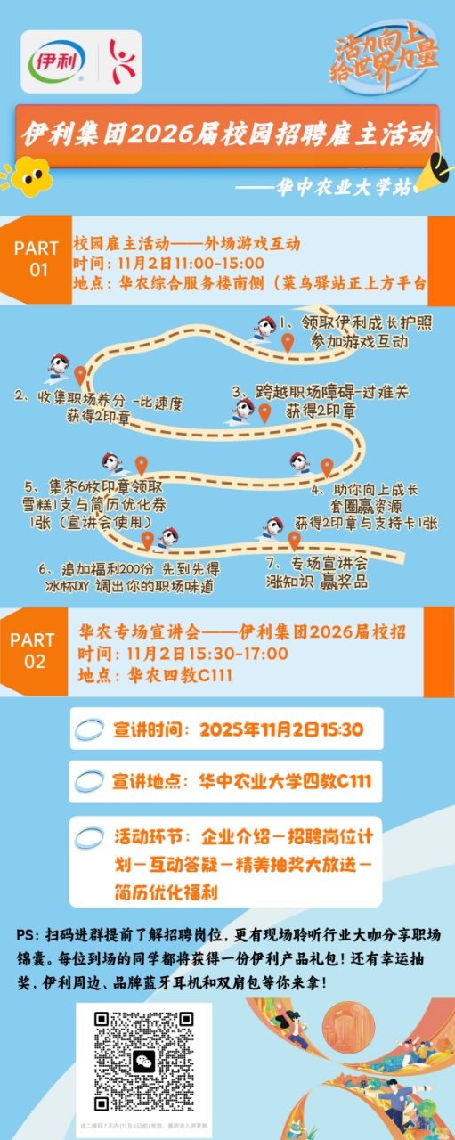 想近距离接触名企、获取职场经验,还能抱走超多福利吗?11月2日,伊利校园雇主活动将落地华农,为你带来一场“福利+成长”的双重盛宴,邀你一起解锁职场新可能!