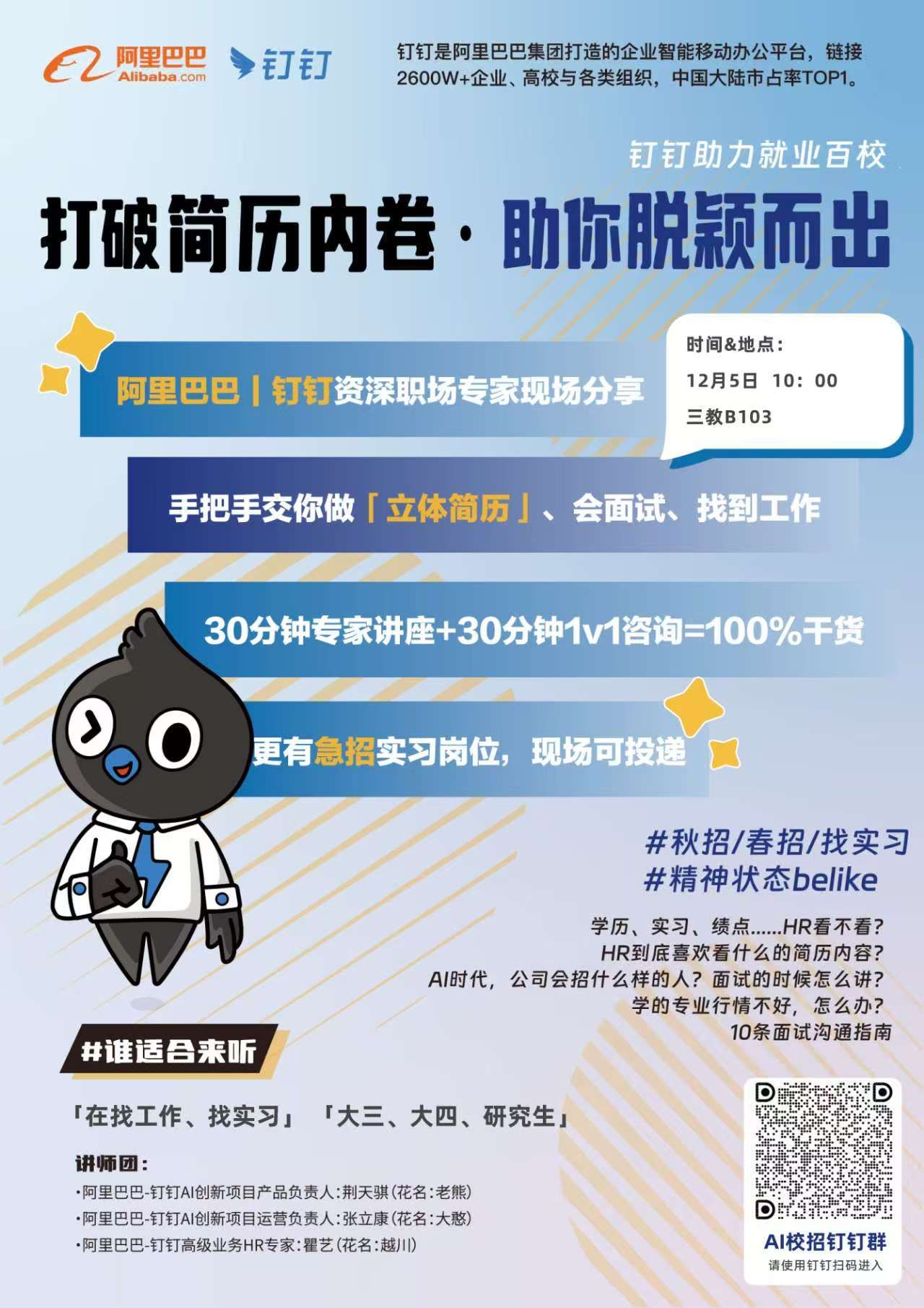 现场有阿里巴巴/钉钉的资深职场专家现场分享,手把手教会大家制作“立体简历”、会面试、找到工作。