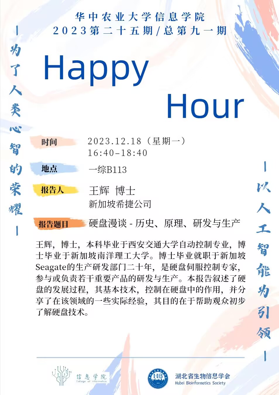 王辉,博土,本科毕业于西安交通大学自动控制专业,博士毕业于新加坡南洋理工大学。博士毕业就职于新加坡Seagate的生产研发部门二十年,是硬盘伺服控制专家,参与或负责若干重要产品的研发与生产。本报告叙述了硬盘的发展过程,其基本技术,控制在硬盘中的作用,并分享了在该领域的一-些实际经验,其目的在于帮助观众初步了解硬盘技术。