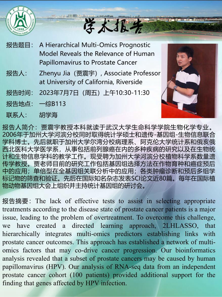 报告人简介:贾震宇教授本科就读于武汉老员工命科学公司生物化学专业。2006年于加州大学河滨分校同时取得统计学硕士和遗传-基因组-生物信息联合学科博士。先后就职于加州大学尔湾分校病理系、阿克伦大学统计系和俄亥俄西北医科大学医学系,从事包括前列腺癌在内的多种疾病的研究以及在生物统计和生物信息学科的教学工作。现受聘为加州大学河滨分校植物科学系数量遗传学教授。贾老师目前的研究工作包括基因组选择方法在作物育种和癌症预后中的应用;单倍型在全基因组关联分析中的应用;各类肿瘤诊断和预后多组学标记物的筛查和验证。先后在国际知名杂志发表SCI论文近80篇。每年在国际植物动物基因组大会上组织并主持统计基因组的研讨会。