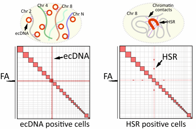 邹艳艳在求学期间,开展了许多方向的课题研究,例如,基因组、单细胞转录组、全基因组关联分析、孟德尔随机化等。曾经的她也很迷茫,担心什么都学而又什么都不专业。即使勤能补拙,但方向太多,不知何从补起。面对这样的困境,她没有闭门造车,而是选择一边从原理补起,一边求助导师,和各个领域的专家沟通交流。得益于视野的开阔,她观察到单细胞转录组质控步骤的一环原理,可以运用在染色体外环状DNA(ecDNA)的表征上来,并以此为基础设计算法,能够在数据层面识别焦点扩增(focal amplification,FA)是否能脱落到染色体外成环,而在此之前的研究主要通过荧光实验肉眼观察。