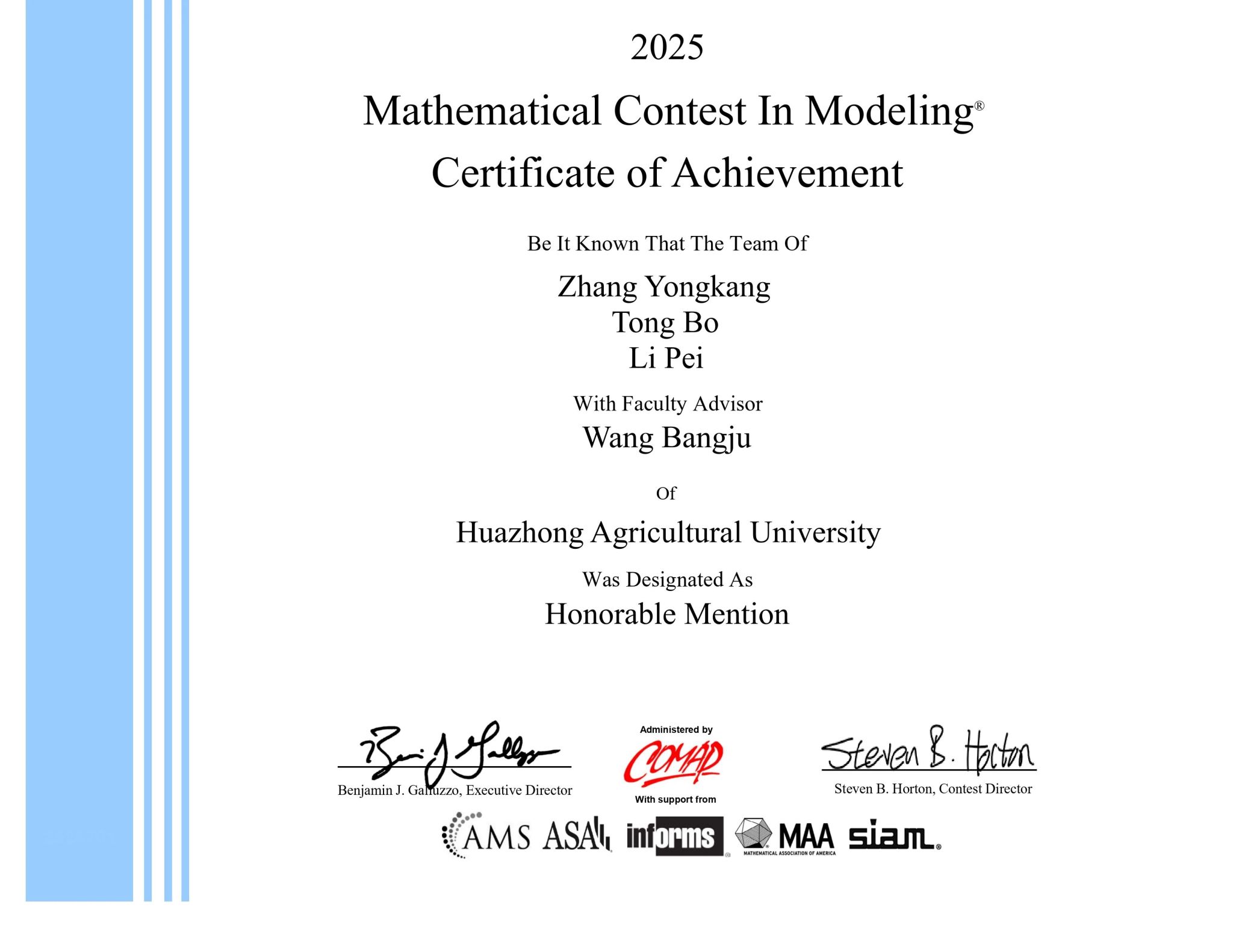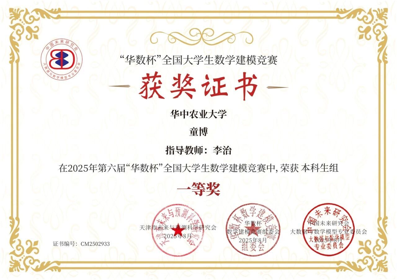 在打牢学科基础的同时,童博积极参与各种学科竞赛,充分筹备,优秀发挥,取得一系列成绩:全国老员工数学竞赛国家级二等奖,美国老员工数学建模竞赛国家级二等奖,华数杯、华中杯老员工数学建模竞赛的省级三等奖、一等奖。为了将所学的丰富科学知识应用于实践,他还参与李秀婷老师指导的省级大创项目《基于动态模式分解的锂电池寿命预测》,通过科学研究,为锂电池剩余电量预测提供数据驱动方法。