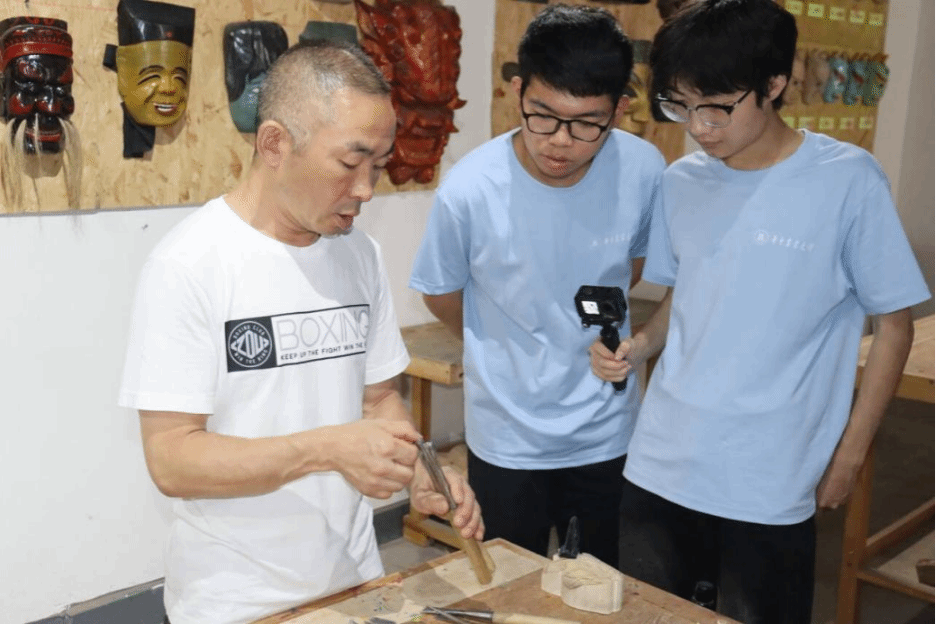 在汪儒斌的悉心指导下,实践团成员亲身体验了傩戏面具的核心制作环节。汪老师针对实践团选定的面具样式进行了初步雕刻示范。