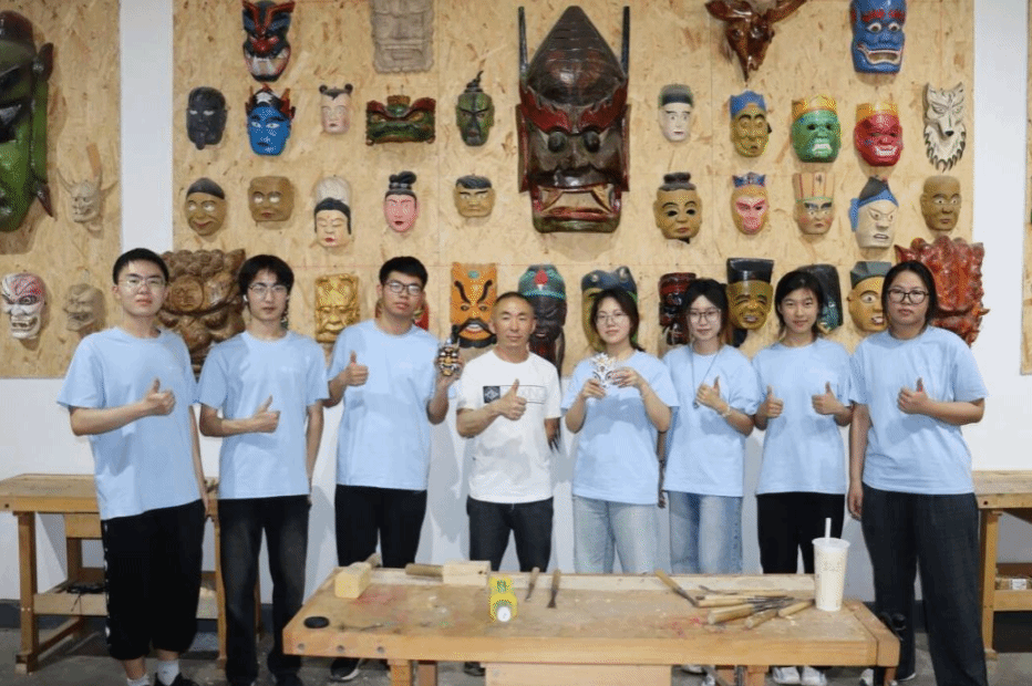 随后,实践团成员轮流尝试雕刻。伴随着锤击声与飞扬的木屑,面具的轮廓逐渐显现。汪儒斌全程指导,并对眼部、额头、獠牙等关键细节的雕刻进行了针对性示范。在共同努力下,实践团成功制作出“传统傩面”与“创新狐面”两款作品,体现了对非遗技艺创造性转化、创新性发展的初步探索。