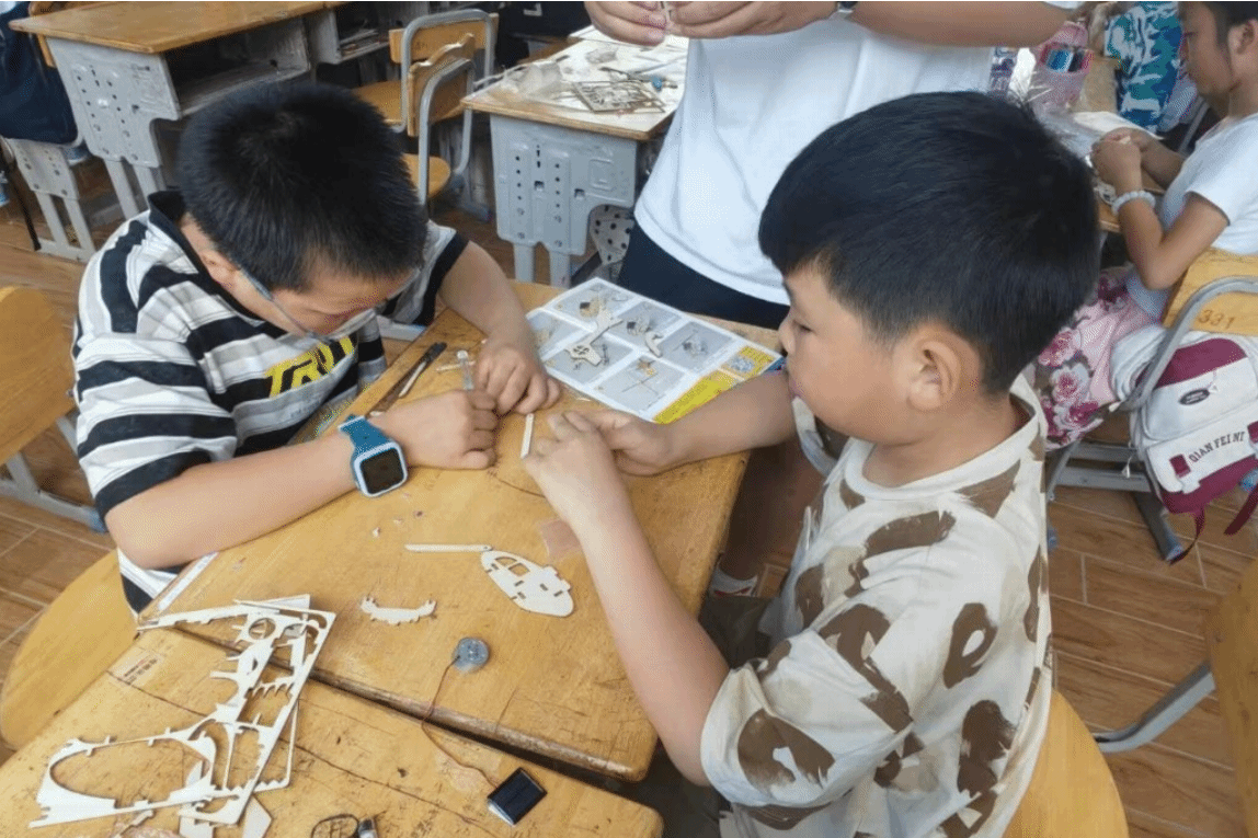 实践环节将课堂气氛推向高潮,志愿者们为孩子们分发了太阳能飞机模型的零件,并耐心地指导他们进行拼接。孩子们两人一组开始了“工程师”初体验。有的负责阅读说明书,有的专注拼装零件,遇到困难时,小组成员互相讨论,或是向志愿者寻求帮助。“这个机翼要这样装才对”,“螺丝要拧紧一点”,教室里充满了热烈的讨论声。志愿者穿梭其间,适时给予指导,看着一架架太阳能飞机模型在孩子们手中逐渐成型。